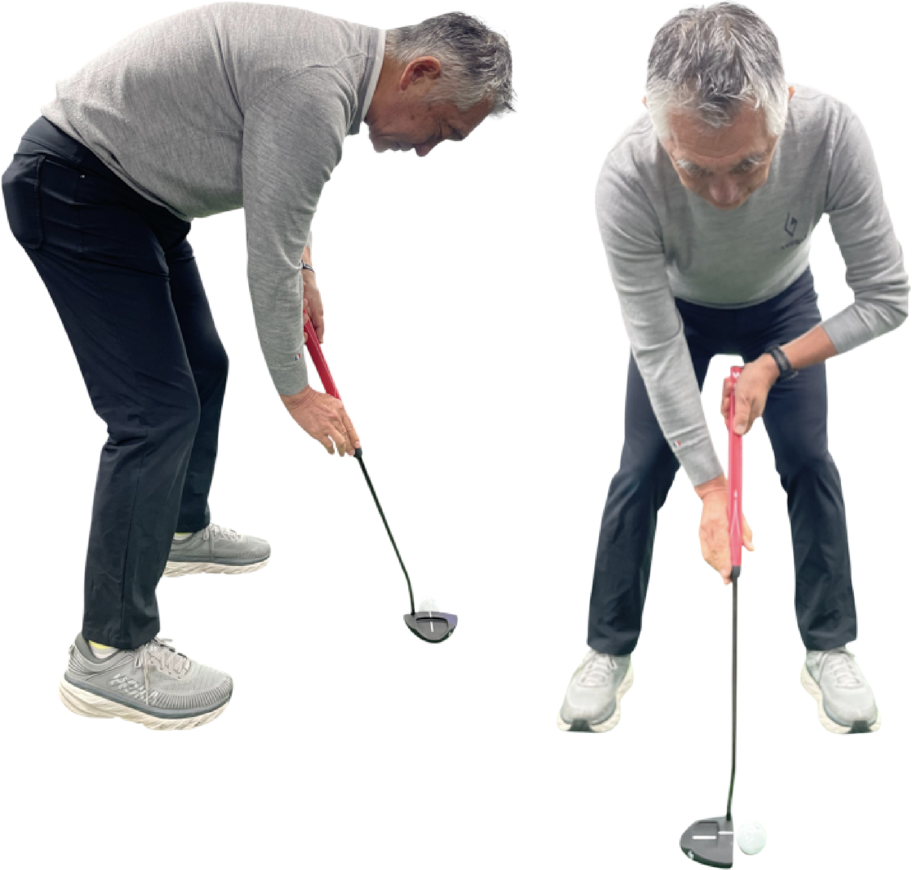 30インチの長さのパターはどのようにストロークをすれば良い結果を導き出すものは ということになります。30インチのパターでARGOLFが推奨するスプリットグリップでアドレスをすると背中は地面に対して平行近くになります。このような状態でストロークをするとライ角に関係なくバックストロークはターゲットラインに沿って動くことになり、より方向性に確実性が増します。
