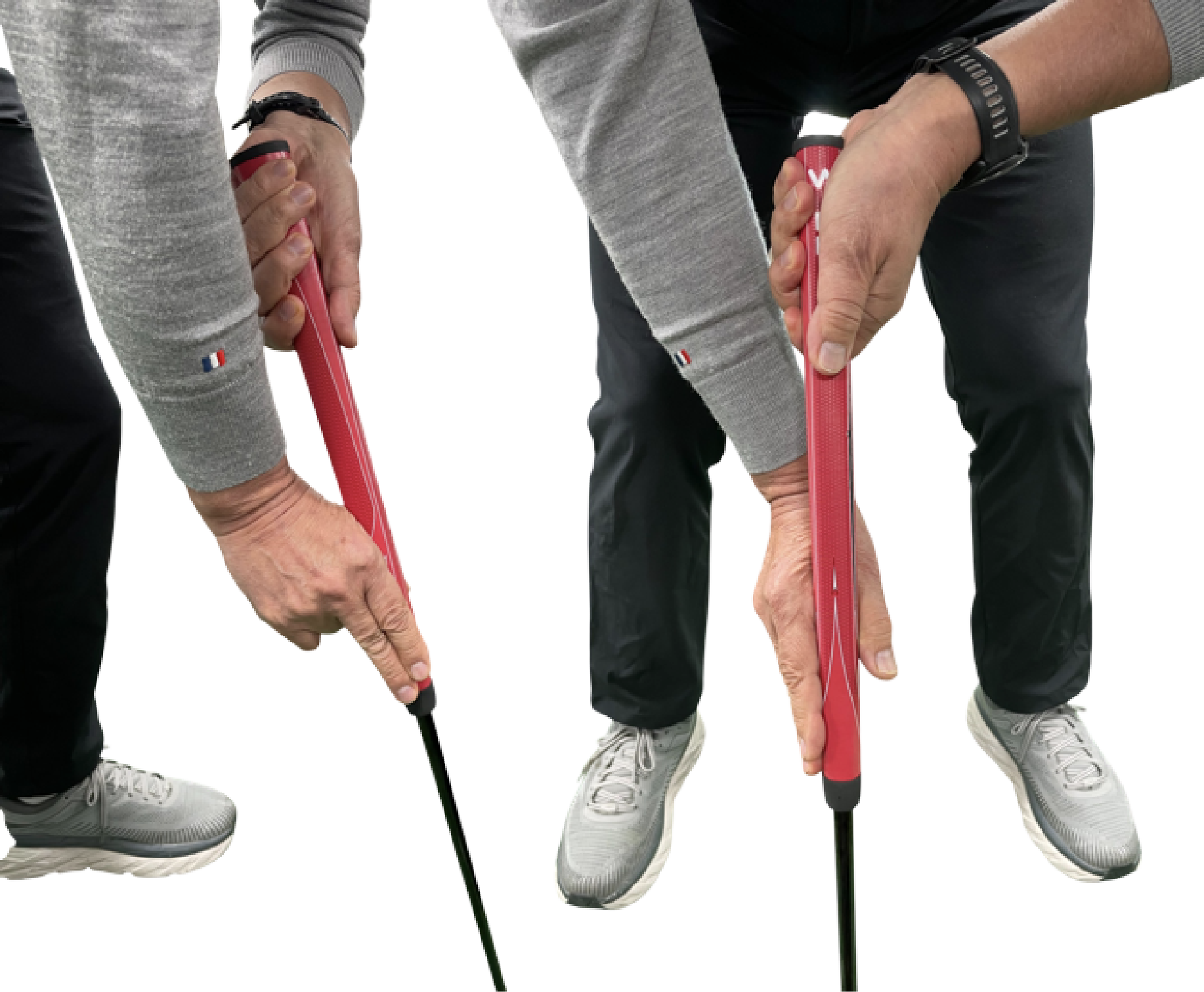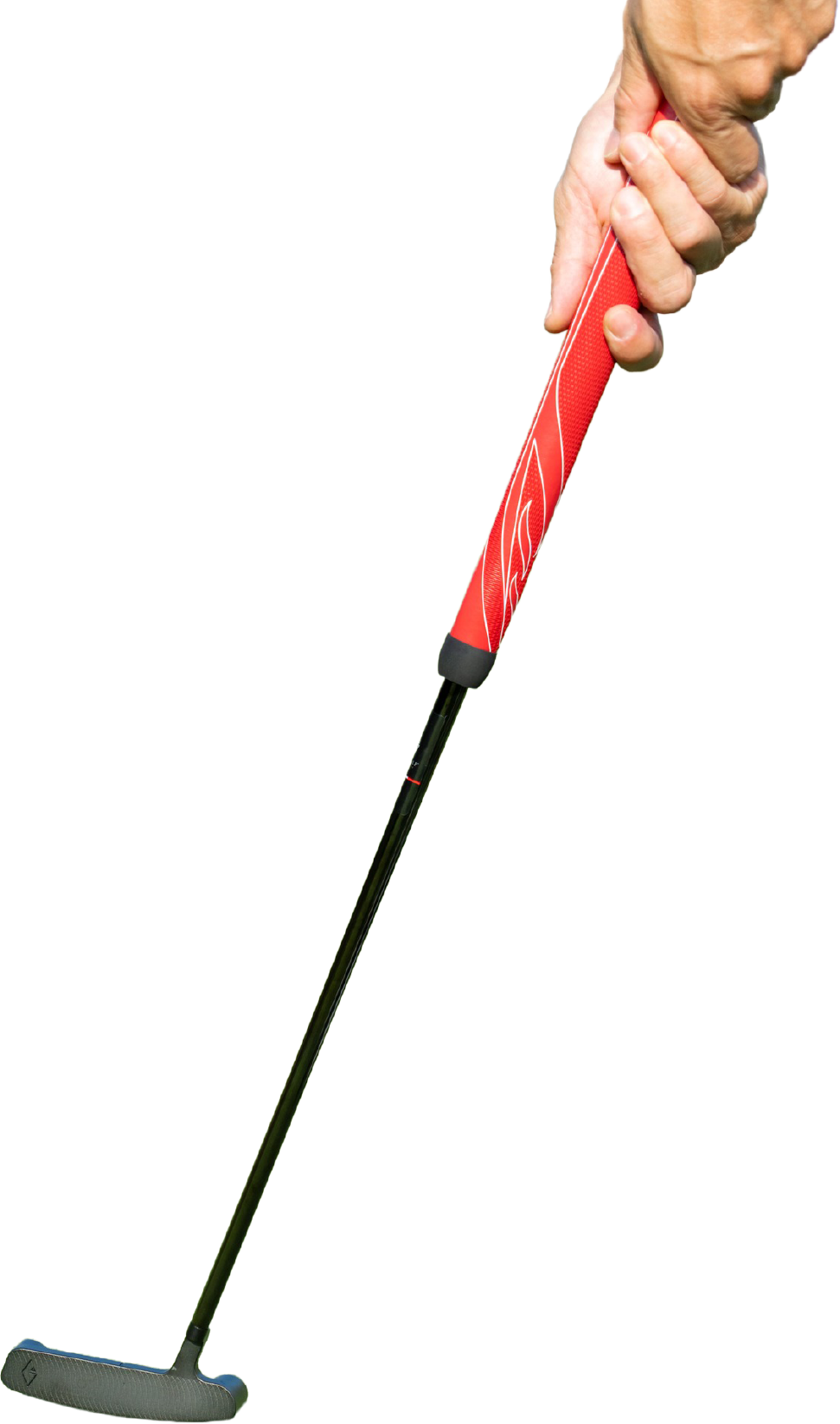 パターヘッドをより自在に操ることができる場所はパターの釣り合い点です。この場所はパターの正しい重さを感じる唯一の地点で、ここから離れるとその距離の二乗で重さが重く変化します。ヘッドから最も離れたところで最も重く感じるところをグリップすることになり、しかもライ角の存在でストローク中は重力の影響をパターは受け続けることになります。
