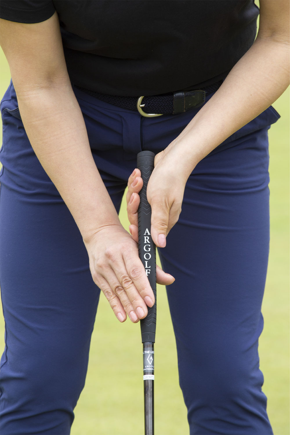 短いグリップサイズの中、両手でヘッドコントロールをしようとするとなかなか思うようにできません。それでこのようなグリップ(握り方)が考えられて自分に合う方法を取り入れているのが現状です。それぞれ一長一短ありますがショートパットには最適とは言えないものです。