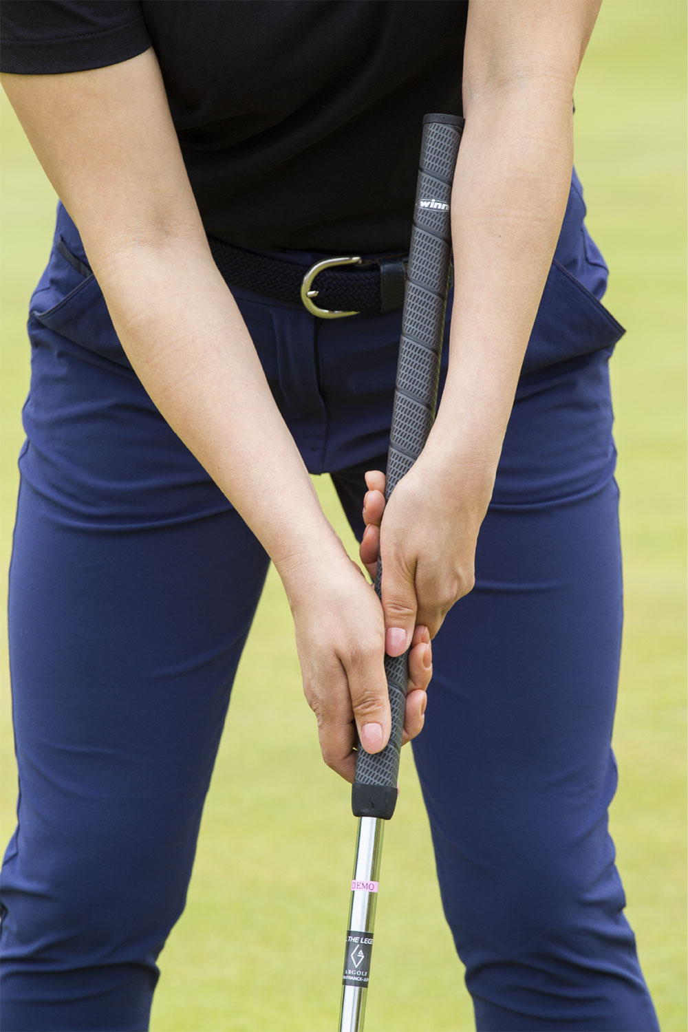 パターの重さと重力の影響を抑えるために利き手でない手(右利きの人は左手)はグリップ圧力が高まり、その結果、利き手はスムースにパター操作ができなくなります。必要以上の力を要するために繊細さが失われ急な加速をしたり、利き手のリストアクションを利用してヘッドを動かそうとします。俗にいうパンチが入る、という現象を引き起こすのです。